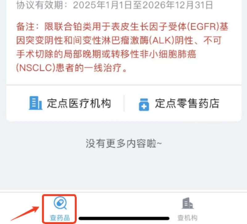 最后,点击“定点医疗机构”或“定点零售药店”,即可查询该药品在各地区的配备情况。