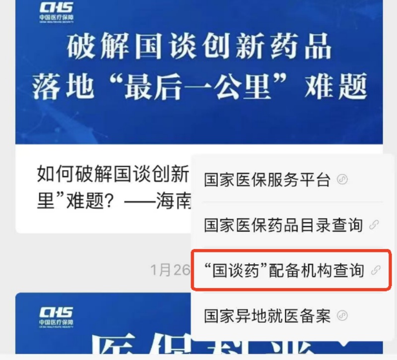 首先,进入“国家医保局”微信公众号后,点击医保服务中的“‘国谈药’配备机构查询”,进入查询页面。