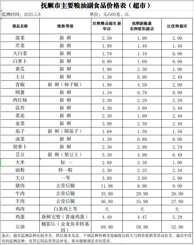 2025年5月8日抚顺市主要粮食副食品价格表(超市)