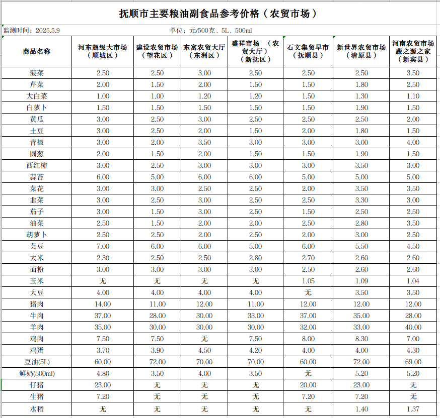 2025年5月9日抚顺市主要粮食副食品价格表(农贸市场)