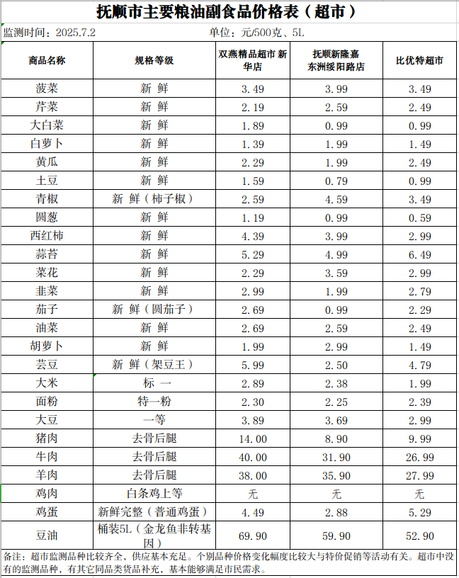 2025年7月2日抚顺市主要粮食副食品价格表(超市)