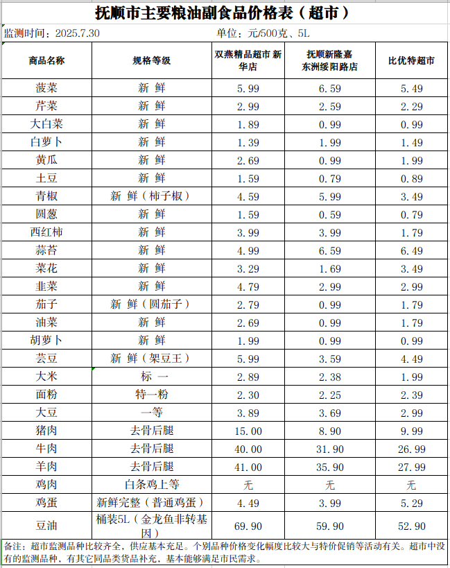 2025年7月30日抚顺市主要粮食副食品价格表(超市)