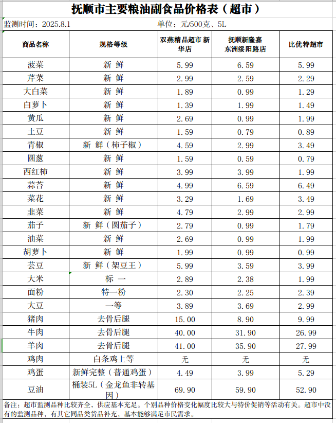 2025年8月1日抚顺市主要粮食副食品价格表(超市)