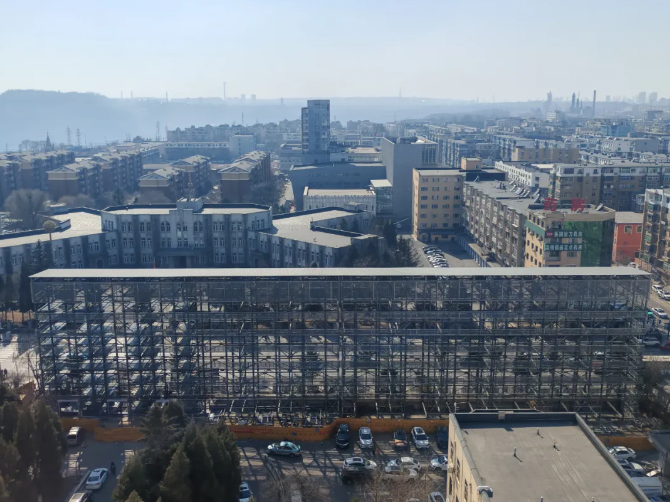 立体停车场在辽宁省健康产业集团抚矿总医院院内,,共计8层12个单元,目前主体框架已完成,正在安装升降机、滑道等。